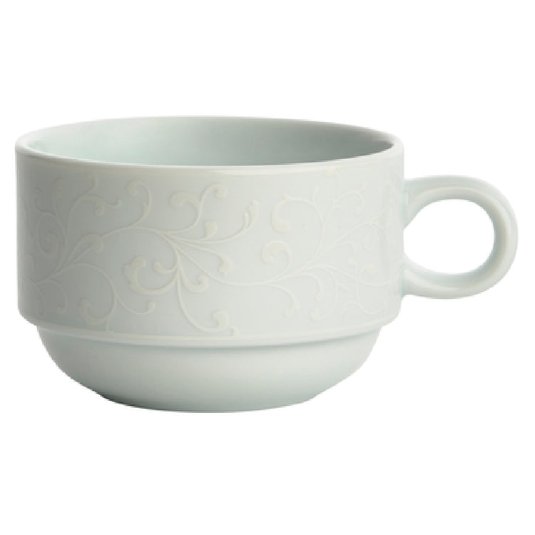 Compared to standard breakfast cups, the 1880 Hospitality L5803050510 model offers enhanced durability with high-grade porcelain and an embossed paisley design that elevates table presentation. Its stackable handle and precise dimensions streamline handling and storage across multiple service settings, which improves operational efficiency. This model’s robust construction supports frequent dishwashing and daily use, ensuring longevity and consistent quality in busy commercial environments.
