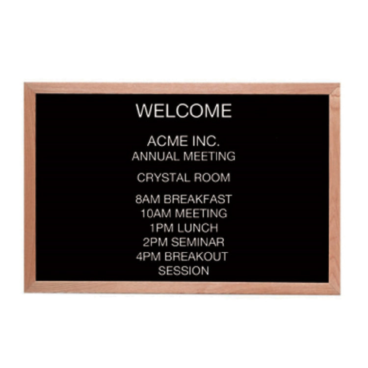 The Aarco AOFD2436L Message Center Board offers a 36" x 24" open face design with a durable oak frame and black felt panel, facilitating fast message changes and easy maintenance. Its sturdy construction withstands frequent handling in commercial foodservice environments, supporting efficient communication. The unit is ideal for indoor application, supporting prominent visibility in busy operational settings, with included Helvetica letters and an assortment tray aiding quick updates and message organization.