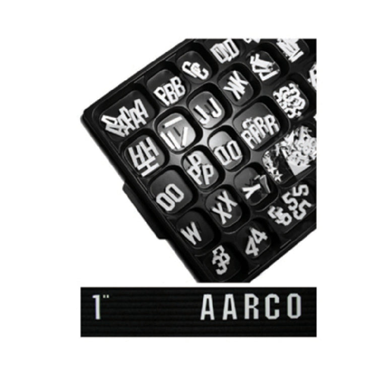 The Aarco GF1.0 Letter Set offers a versatile and durable solution for commercial signage, featuring injection-molded characters with a gothic style font for high visibility. Its 1-inch height ensures legibility in busy environments, while the universal single tab facilitates quick mounting on various surfaces. The included assortment tray with identification symbols simplifies inventory management, supporting efficient workflow in foodservice operations. Ideal for both permanent and temporary signage, this set withstands frequent handling and cleaning, making it suitable for high-traffic kitchen, bar, and restaurant applications.