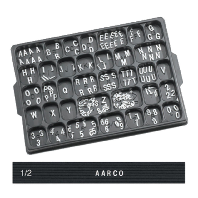 AARCO Products, HF.50, Letter Set, 1/2"H, Helvetica typeface, universal single tab, 165 characters, injection molded, includes assortment tray with identification symbols, white