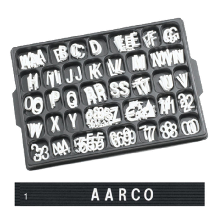 The Aarco HF1.0 Letter Set is tailored for commercial foodservice users needing dependable signage and labeling in busy kitchens and service areas. Its injection-molded construction offers exceptional durability, while the 1-inch Helvetica characters facilitate fast recognition. The universal single tab design simplifies installation across different signage holders, streamlining workflow management. The included assortment tray with identified symbols enhances sorting and inventory control, reducing setup time for short- and medium-term displays. Designed for professional environments, it supports clear communication in high-traffic facilities, ensuring operational efficiency.