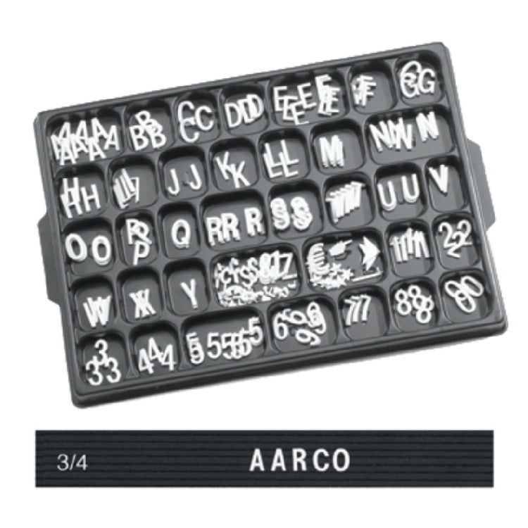 The Aarco HFD.75 Letter Set 3/4"H Helvetica Typeface is a professional-grade signage accessory designed for high-precision labeling applications in commercial foodservice environments. This letter and number set features injection-molded white characters in a Helvetica font, measuring 3/4 inches in height, and includes a universal single tab for seamless integration. With a capacity to display up to 330 characters, this set provides clarity and consistency in menu boards, aisle signage, and identification labels, making it an essential component for restaurant kitchens, cafeterias, and hospitality facilities seeking durable, easy-to-maintain signage solutions.