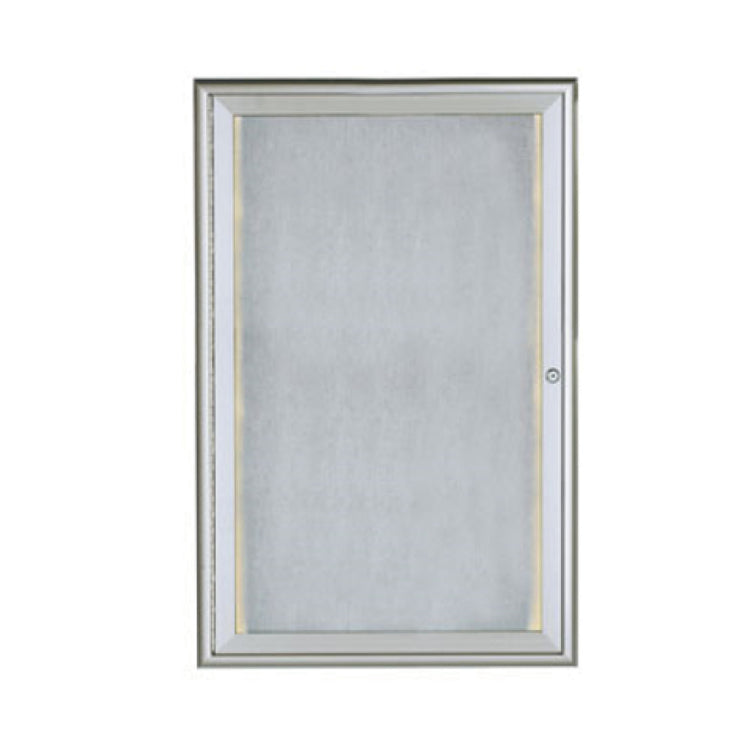 The Aarco LOWFC3624 Waterfall Bulletin Board is a commercial-grade message center board designed for indoor and outdoor use. This 24-inch wide by 36-inch high enclosed display features a contemporary design with a burlap weave vinyl surface, providing a durable backdrop for postings. Constructed with an aluminum frame and protected by clear acrylic safety glass, it offers enhanced vandal resistance and ease of maintenance, making it suitable for high-traffic environments such as hospitality, education, and retail settings. This model's lockable full-length hinges ensure secure access, while integrated LED lighting and a power cord facilitate visibility, supporting efficient communication in busy workflows.