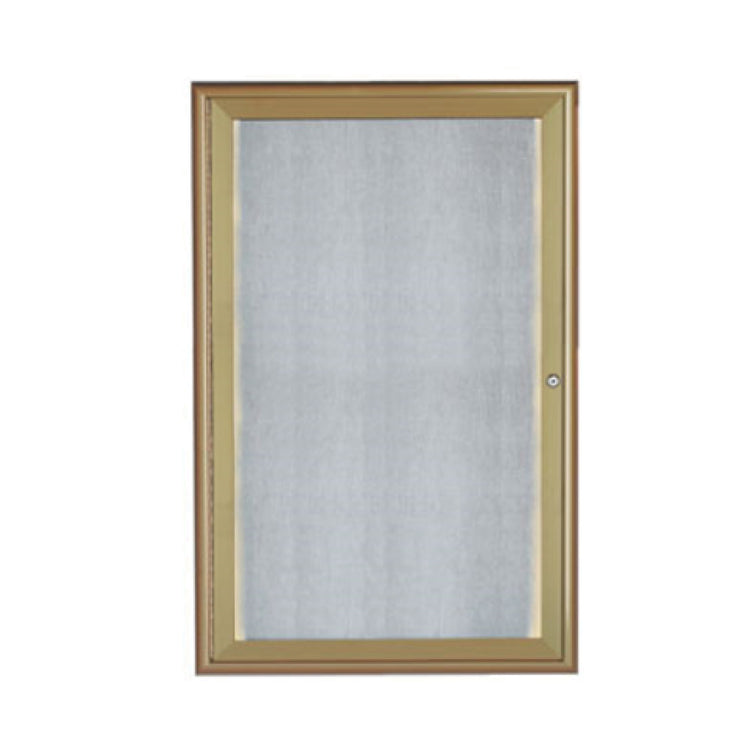 AARCO Products, LOWFC3624LB, Waterfall Bulletin Board, 24"W x 36"H, enclosed, contemporary design, burlap weave vinyl surface, aluminum frame, clear acrylic safety glass, full length hinges, lockable, LED lighting, power cord, concealed mounting brackets, indoor/outdoor use, antique brass finish
