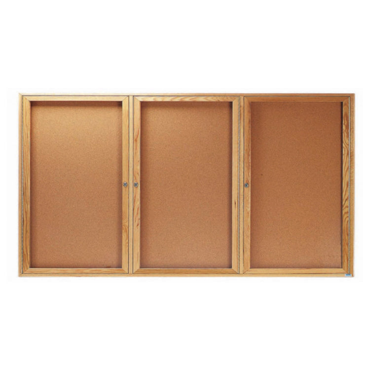 This bulletin board features a secure, enclosed design with (3) swing doors, facilitating easy access and secure display. The high gloss lacquer finish enhances longevity and ease of maintenance, while the natural pebble grain cork back panel allows for straightforward pinning. Its wood frame ensures stability and durability in busy commercial settings, and the 36" height with 72" width offers substantial visibility. Ideal for wall-mounted applications, it supports frequent updates and visual communication workflows in busy environments.