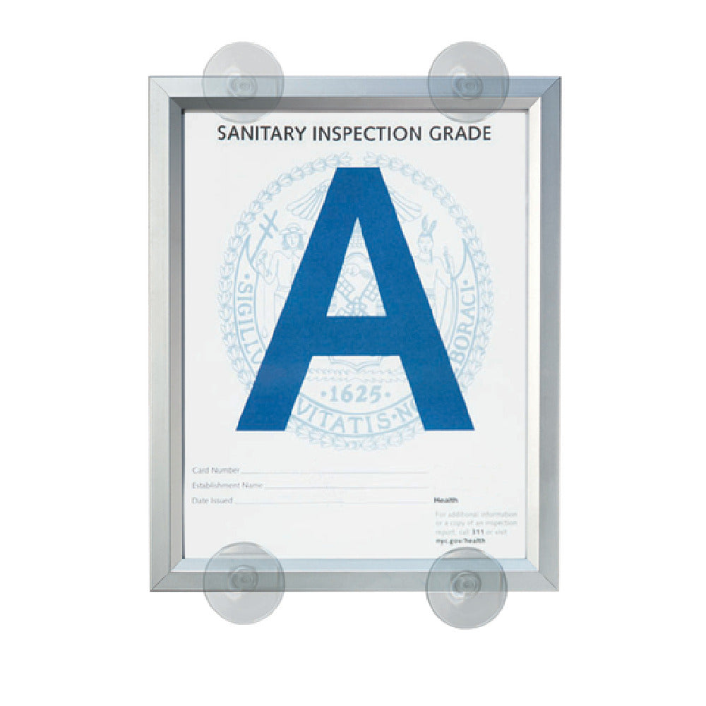 The Aarco OTW118 Sign Holder is engineered for reliable performance in commercial settings, featuring a durable aluminum frame finished in silver, supporting a clear acrylic cover that measures 11 inches by 8-1/2 inches. The unit has a total weight of 2 lbs, designed for easy installation and repositioning. Its four suction cups are crafted to provide a strong grip on glass surfaces, facilitating secure attachment without adhesives or hardware. Built in the USA, the sign holder operates passively, with no electrical requirements, and withstands typical indoor temperature ranges suitable for storefronts and display windows. Maintenance involves regular cleaning of the acrylic cover with a soft cloth, while the suction cups ensure quick removal or repositioning as needed. The sign holder is compatible with standard signage inserts and requires no assembly other than attaching to glass surfaces.