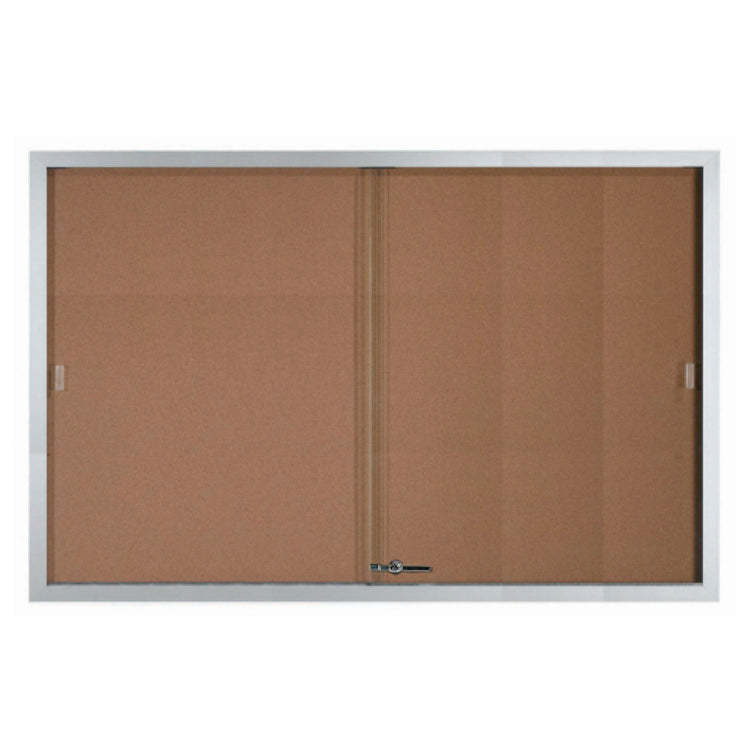 The Aarco SBC4872 Bulletin Board offers a durable enclosure with a tempered glass sliding door for secure, vandal-resistant display management. Its natural cork back panel ensures reliable pin retention, while the satin aluminum frame stands up to frequent use in high-traffic areas. Designed for wall mounting, it accommodates extensive posting needs with straightforward access, supporting efficient communication workflows in institutional and commercial spaces.