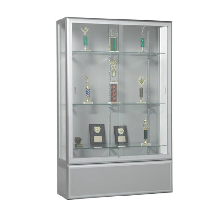 The Aarco WFDC7648S display case features a self-contained refrigeration-free construction suitable for showcase environments, with dimensions of 48" width, 20" depth, and 76" height. Made from durable materials including aluminum and tempered glass, it offers a sleek satin silver finish to resist corrosion and support frequent cleaning. The unit operates efficiently in standard ambient conditions and is designed for countertop or freestanding placement in retail, museum, or hospitality applications. Its construction supports secure storage with glass sliding doors incorporating inline locks, ensuring item security. The lighting system consists of energy-efficient LEDs, providing bright illumination without excess heat. Shipping weight is approximately 150 lbs, with freight class 70, and it typically ships within 4-8 business days, ideal for professional use in mid-volume display settings. Electrical requirements are standard line voltage, and the unit complies with industry safety standards, supporting high-traffic display environments.