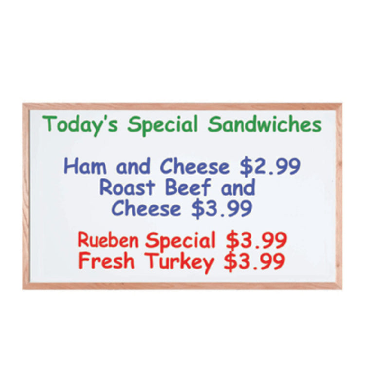 A commercial write-on board is a durable, large-format visual display surface designed for frequent update and presentation in professional environments. The Aarco WOC3660NT is a 60-inch by 36-inch whiteboard with a high-gloss finish and a solid red oak frame, suited for training rooms, offices, and conference spaces. Its construction supports consistent use, clarity of communication, and easy maintenance, making it ideal for mid-volume administrative or instructional applications requiring clear visual communication and rapid content updates in business and educational settings.