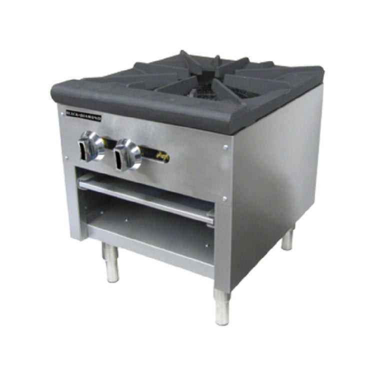 The Admiral Craft BDCTSP-1/NG Black Diamond Stock Pot Burner is a commercial gas range designed for high-capacity foodservice applications. Featuring a robust 3-ring burner with dual control valves, it provides precise flame adjustments suitable for large stock pots. Constructed with an all stainless steel exterior, this industrial-grade unit offers durability and ease of maintenance. With a removable 1-7/8" thick cast iron grate and crumb tray, cleaning and servicing are streamlined. Equipped with two standing pilot lights, it ensures reliable ignition, and its adjustable 6" legs facilitate stable installation. Compatible with field conversion for LPG, this model delivers 80,000 BTU, with a 3/4" rear NPT connection, built for demanding commercial kitchens requiring dependable high wattage performance and efficient workflow integration.