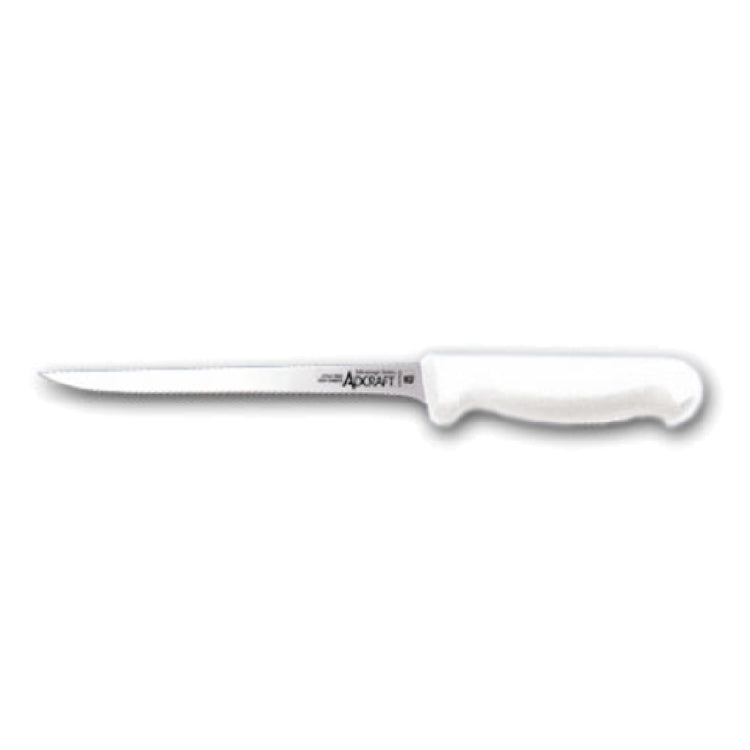 A commercial boning and fillet knife is a precision cutting tool designed for removing bones and filleting fish or meat in high-volume food operations. Typically featuring a narrow, flexible or stiff blade made from high-quality steel, these knives enable detailed cuts with minimal waste. Installed in seafood counters, butcher shops, or culinary stations, the Admiral Craft CUT-8NFBWH offers a durable, straight-edged solution ideal for seafood and meat processing at medium workloads, supporting efficient, controlled slicing and deboning tasks in professional kitchens.