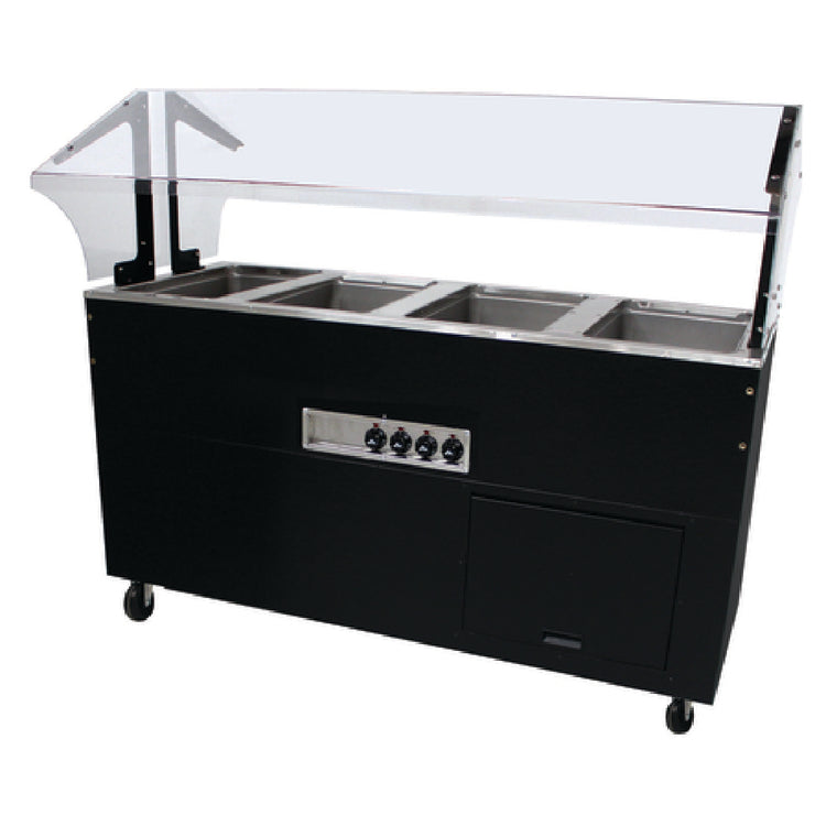 Advance Tabco, BSW4-120-B-SB, Portable Hot Food Buffet Table, electric, stainless steel top, matte black vinyl steel clad body, (4) 12" x 20" hot food wells (accommodates pan inserts up to 6-1/4" deep), sealed wells with manifold drains, infinite controls, fiberglass insulation between wells, food shield (sneeze guard) (thermoplastic top with acrylic end panels), solid base, removable front panel, 4" swivel casters with (2) brakes, NSF, UL (120v)