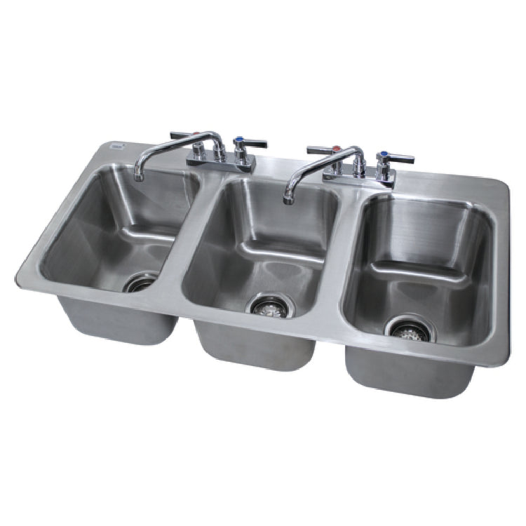 Advance Tabco, DI-3-10, Drop-In Sink, 3-compartment, 10" wide x 14" front-to-back x 10" deep each/bowl, 18 gauge 304 stainless steel, deck mounted 8" swing spout faucets, basket drains