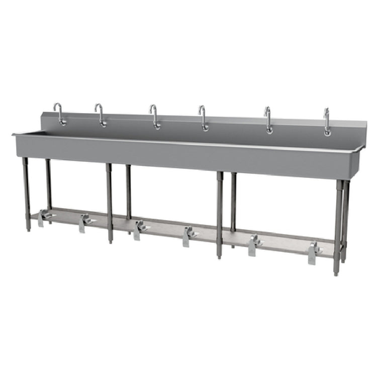The Advance Tabco FS-FM-120FV Multiwash Hand Sink with splash mount faucet provision represents a robust, commercial-grade hand wash station designed for high-use environments. Crafted from 14-gauge 304 stainless steel, this freestanding model measures 120 inches in width, 19.5 inches in depth, and stands at 42.5 inches in height, offering ample workspace and durability. It features a 16" front-to-back by 8" deep bowl with an 8-1/2" backsplash, providing a functional wash area ideal for industrial and institutional settings. Punched with six faucet holes, it accommodates gooseneck spouts and a toe-operated push valve for hygienic, hands-free operation. Complete with stainless steel legs, flanged feet, and pedal bracket support, this sink ensures stability and ease of maintenance, while the inclusion of three 3-1/2" rear basket drains facilitates efficient waste management. Designed for demanding foodservice applications, the Advance Tabco FS-FM-120FV is engineered to withstand frequent use in busy commercial kitchens and sanitation stations.
