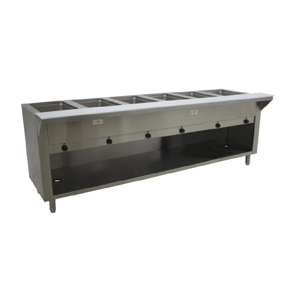 A commercial hot food service counter is a stationary foodservice unit designed for holding and displaying hot dishes in high-volume settings such as cafeterias, buffets, or catering venues. It typically features multiple open wells, temperature controls, and durable construction to ensure consistent, safe food presentation. The Advance Tabco HF-6E-240-BS hot food table specifically supports efficient heat retention and organization with six 12" x 20" open wells, individual thermostat controls, and stainless steel surfaces for sanitation and longevity. It is installed to optimize workflow in foodservice operations requiring reliable hot-held foods for extended periods, ideal for medium-volume restaurant service and institutional foodservice environments.