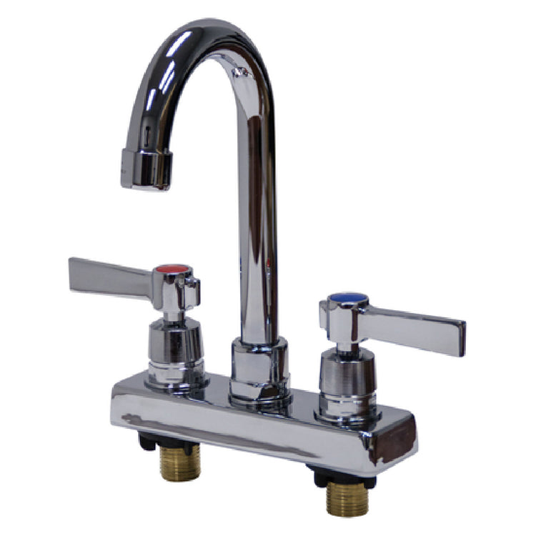 The Advance Tabco K-52 faucet features a stainless steel construction with lead-free compliance, ensuring food-safe operation. It mounts on a deck with 4" centers and includes a 3-1/2" gooseneck spout designed for ease of use. The overall weight of 4 lbs allows for manageable installation, with a standard durability suitable for continuous commercial use. It operates under standard water pressure conditions, with a corrosion-resistant finish that withstands frequent cleaning. The fixture does not require electrical connections and is compatible with typical restaurant plumbing setups. Dimensions include a 3-5" spout length, supporting versatile installation in various kitchen layouts.