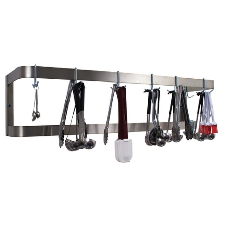 The Advance Tabco SW-96 Pot Rack is designed for durable, industrial use with precise technical features. It features a stainless steel rack construction measuring 96 inches in width, 12 inches in depth, and a height of 12 inches, supporting substantial cookware loads. The rack weighs approximately 48 pounds and mounts securely to walls, facilitating quick installation with minimal clearance. Its materials are food-safe, corrosion-resistant, and easy to clean, suited for high-volume kitchen environments. Powerfully built, it supports moderate to heavy workloads while maintaining structural integrity over long-term use. The included plated double pot hooks are engineered for easy attachment and retention, supporting various pot sizes and weights, with a typical capacity well-suited for restaurant and institutional settings. The overall design emphasizes robust construction and ease of maintenance, relying on stainless steel surfaces that withstand frequent cleaning and rigorous use.