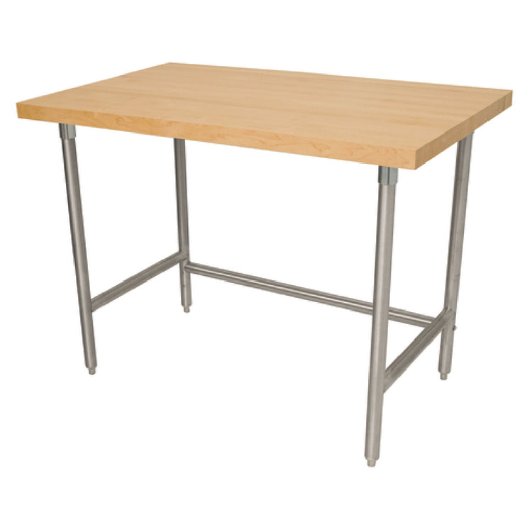 Unlike standard work tables, the Advance Tabco TH2S-368 offers a high-density laminated hard maple top combined with stainless steel support elements for longitudinal durability. Its open base with crossrails enhances stability and simplifies cleaning, reducing maintenance time. The unit’s construction supports rigorous use in commercial kitchens, ensuring longevity and sanitary compliance without compromise to operational efficiency.