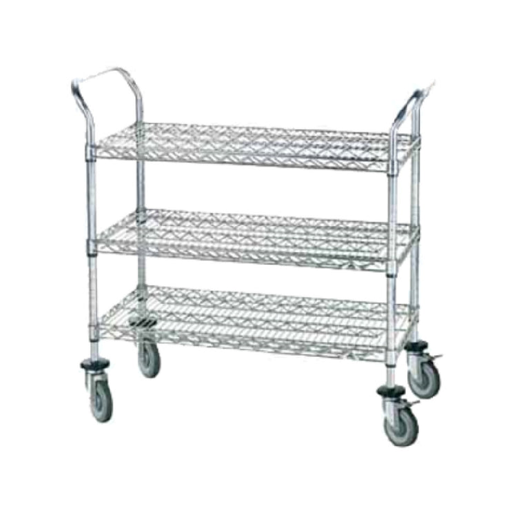 The wire utility cart WUC-1836R-X provides a resilient framework with three spacious chrome-plated shelves, optimized for transporting bulk supplies or kitchen components. Its construction from heavy-duty materials ensures long-term durability under constant use, while the swivel rubber casters with donut bumpers facilitate easy repositioning on high-traffic floors. Designed for easy cleaning and maintenance, the cart supports quick sanitation routines essential in commercial kitchens. Suitable for moderate workflow environments, it's ideal for transporting utensils, ingredients, or dishware in busy foodservice settings.