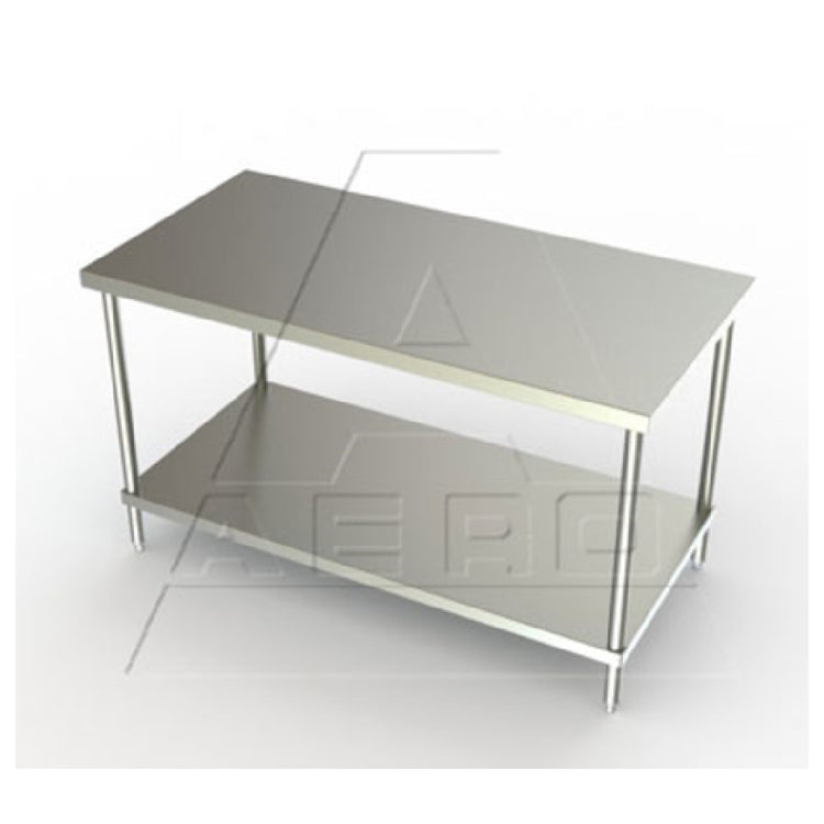 A commercial work table is a sturdy, food-safe surface designed for food prep, assembly, and storage in professional kitchens. The AERO Manufacturing 2TS-4260 is a stainless steel work table with reinforced construction, ideal for moderate volume food preparation applications. Its 14-gauge stainless steel top and galvanized steel box channels ensure durability and stability during intensive use. Typically installed in restaurant kitchens, bakeries, or catering facilities, this model supports efficient workflows and sanitation standards, making it suitable for medium-scale foodservice operations.