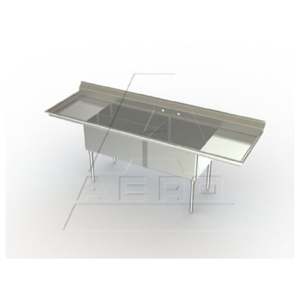 The AERO Manufacturing 3CP-3-18LR Supermarket Sink Meat & Platter Three Compartment is a commercial-grade foodservice equipment designed for efficient meat, produce, and platter preparation in supermarket and commercial kitchen environments. Crafted from 16-gauge 300 series stainless steel, this fully welded unit offers durability and corrosion resistance. It features three compartments—(2) 12"W x 32" L-R and a 24"W x 24" L-R bowl—each with a 14-inch depth and a 7-inch splash height, providing ample capacity for processing and washing tasks. The sink is equipped with 18-inch drainboards on both sides for efficient workflow, built-in stainless steel gussets, corrosion-resistant legs, and adjustable white metal feet for stability. Its fully welded construction ensures sanitation and longevity, making it ideal for high-volume meat, seafood, and produce operations in supermarket and institutional settings. This model ships knocked down for easy installation and maintains compliance with food safety standards.
