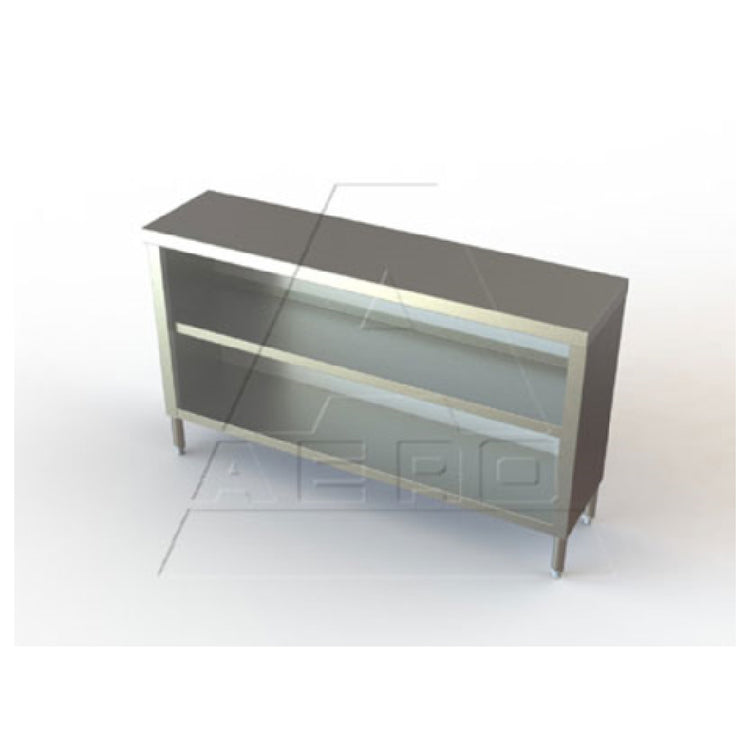 The AERO Manufacturing DC-15120 Dish Cabinet is a commercial-grade storage solution designed for high-volume foodservice environments requiring durable, accessible dish organization. Constructed with a 16 gauge 300 series stainless steel top featuring a rolled edge, this 120-inch wide by 15-inch deep cabinet provides enhanced corrosion resistance and structural integrity. Equipped with two stainless steel undershelves and mounted on 6-inch legs, it supports efficient workflows in busy kitchens and dishrooms, accommodating large quantities of dishware while maintaining ease of cleaning and maintenance.