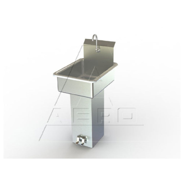 This stainless steel hand sink from AERO Manufacturing delivers precise functionality with a pedestal-mounted design ideal for confined kitchen spaces. It incorporates foot pedal valves for touchless control, a gooseneck splash mount spout for effective handwashing, and a 20" front-to-back bowl dimension suitable for frequent use. The 16" width and 8" deep bowl optimize access and ease of maintenance, supporting quick disinfection routines critical for sanitary standards in commercial foodservice environments. Designed for durability, it withstands heavy daily use and simplifies workflow in healthcare, restaurant, or prep station applications.