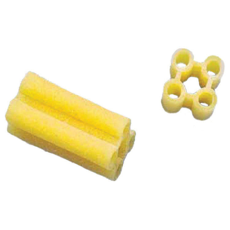 This extrusion die offers excellent function with a robust bronze construction, ensuring long-term durability against wear and tear. Its four-corner looped design improves shape consistency and pasta surface quality, reducing defect rates in mass production. The die's precise dimensions facilitate seamless integration with various extruders, and its easy disassembly supports straightforward cleaning and maintenance. Ideal for mid-volume pasta producers, it enhances workflow efficiency by consistently producing uniform looped pasta shapes for commercial kitchens or specialty restaurants.