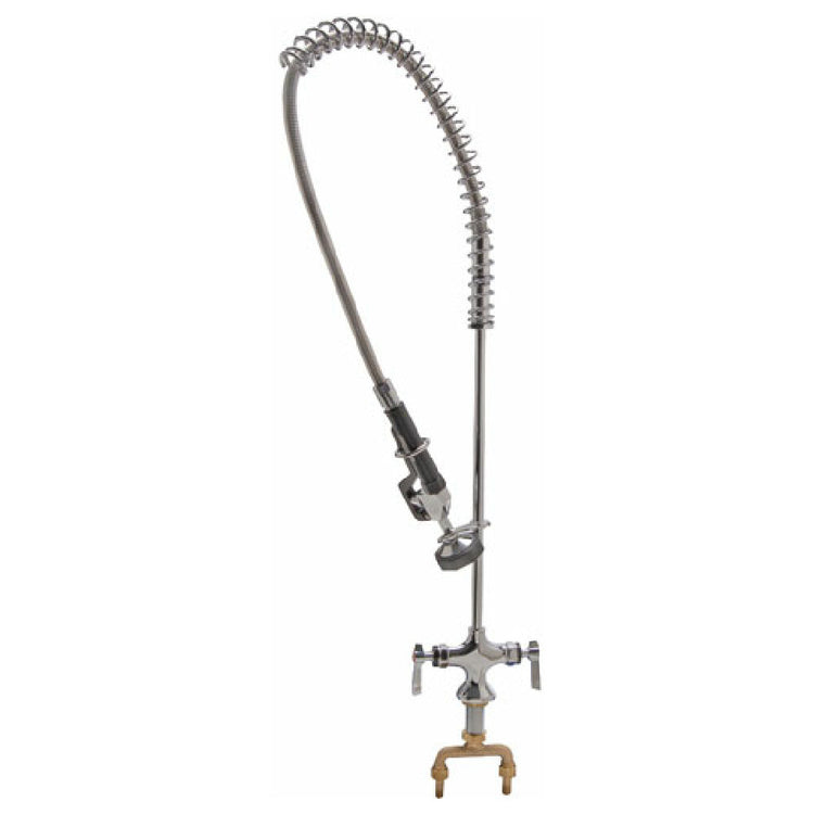 The KN50-1000 assembly features a 3-inch height, 4.5-inch width, and 26.5-inch depth, weighing approximately 11.42 lbs for robust durability. Manufactured from lead-free brass with chrome plating, it offers a corrosion-resistant surface ideal for frequent cleaning and sanitation. The unit’s design includes a water-saving spray face and a 1/4" NPT male inlet connection, facilitating straightforward plumbing integration into deck-mounted systems. It operates under standard plumbing pressures, with dimensions tailored for commercial dishwashing and prep station applications. This assembly is intended for permanent installation, combining high performance with simple maintenance, supported by its compatibility with typical deck-mount configurations and its component longevity for demanding foodservice workflows.