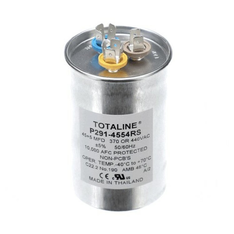 A commercial dual capacitor is an electrical component used to support starting and running functions for HVAC motors such as compressors and fans in refrigeration and air conditioning systems. The Carrier P291-4554RS is a production-ready OEM model, featuring a 45/5 microfarad rating and operating at 440 volts, designed for reliable motor performance. It is typically installed in commercial refrigeration equipment, HVAC units, or climate control systems to ensure energy efficiency and consistent operation, especially in foodservice environments like walk-in coolers or restaurant HVAC setups. Its durable construction and precise specifications support high-demand applications where dependable capacitor function is essential for continuous system operation and optimal temperature regulation in commercial kitchens and cold storage facilities.