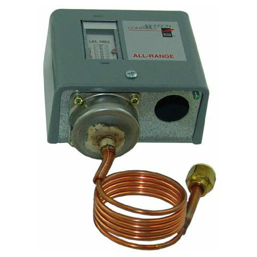 A commercial pressure control device is an industrial component designed to monitor and regulate system pressures within plumbing, refrigeration, and HVAC systems. The Johnson Controls P70AB2C is a model that functions as a low-pressure cut-out or capacity control, installed in commercial refrigeration and air conditioning equipment. It features precise pressure regulation over a range of 20" to 100" (-68 to 690 kPa), with differential adjustments, robust construction for durability, and easy integration via flare fittings. This device is essential for maintaining system efficiency and safety in commercial environments such as grocery stores, cold storage, and HVAC applications, ensuring optimal operation under fluctuating pressure conditions.