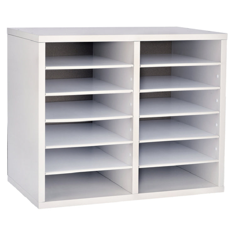 The Alpine Industries ADI500-12-WHI Paper Sorter/Literature File Organizer is a commercial-grade storage unit designed for organized document management within professional environments. Constructed from durable wood with a clean white finish, it features 12 adjustable compartments suitable for sorting papers, literature, or small wares in offices, print centers, or hospitality spaces. Its technical design emphasizes stability and ease of access, making it an essential component for efficient workflow in medium-traffic administrative settings.