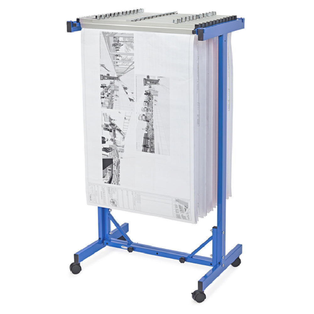 The expandable mobile plan center offers robust tubular construction for enhanced durability, with a height of 51 inches that accommodates large blueprint stacks. Its steel framework ensures longevity in demanding settings, while four high-quality casters facilitate effortless mobility across workspaces. The blue finish adds visual organization, and the unit's design supports streamlined workflow by enabling easy access and transport of large plan sets. Suitable for architectural firms, engineering offices, and construction sites, this plan center integrates seamlessly into high-activity environments requiring reliable document handling and flexible storage solutions.