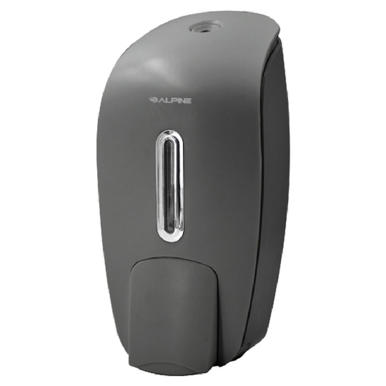 Alpine Industries, ALP425-GRY, Soap & Hand Sanitizer Dispenser, surface mount, manual, 27 oz. (800ml) capacity, 4-3/5"W x 4-1/10"D x 9-3/5"H, dispenses 1000 times per fill, clear soap/sanitizer level indicating window, lock feature, ABS plastic, gray, ADA Compliant