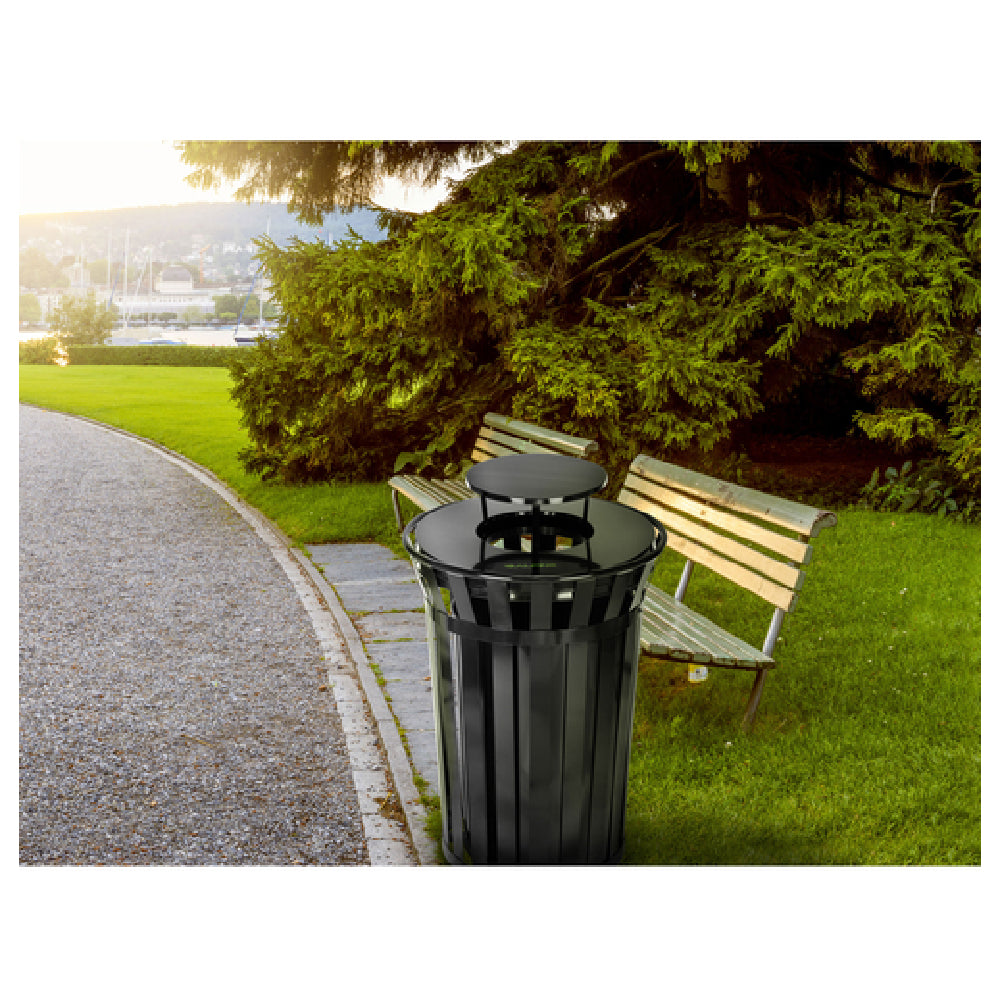 The Alpine Industries ALP479-38-1 Outdoor Metal Slatted Trash Receptacle with Rain Bonnet Lid is a commercial-grade waste container designed for outdoor and indoor environments. Constructed with durable metal slats and a weather-resistant rain bonnet lid, it offers a 38-gallon capacity suitable for high-traffic areas such as public parks, commercial campuses, and hospitality settings. Its robust black finish enhances longevity while providing a sleek appearance, and the rain bonnet lid prevents precipitation ingress, maintaining waste containment integrity in variable weather conditions. This receptacle addresses the need for durable, easy-to-maintain outdoor waste management solution with precise dimensions and a sturdy build.