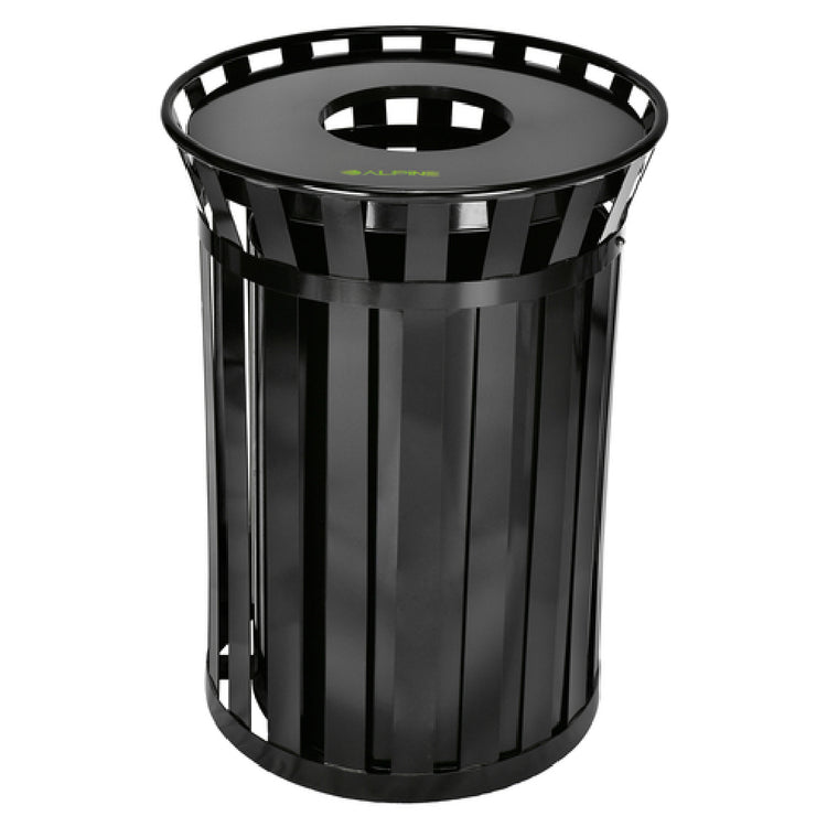 The Alpine Industries ALP479-38 outdoor metal waste receptacle features a model number ALP479-38 and measures 36 inches in height with a 26.7-inch diameter, crafted from durable metal with a black finish. It weighs approximately 83 lbs, emphasizing its sturdy build suited for heavy-duty outdoor use. The unit is designed without a lid, allowing for quick waste disposal, and is compatible with standard outdoor waste management workflows. Its construction materials meet industry standards for weather resistance, supporting long-term performance in diverse environmental conditions. The receptacle does not include specific electrical or cooling components, emphasizing its mechanical robustness for waste containment.