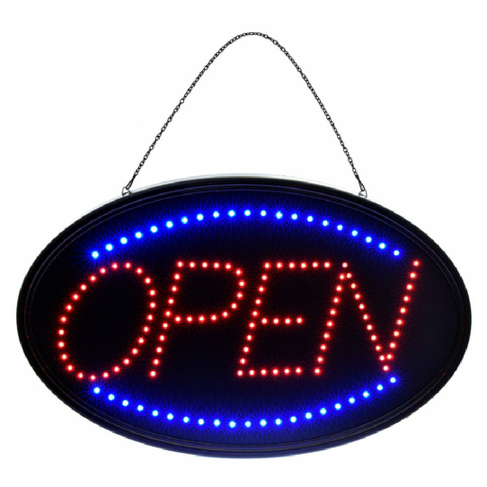 Alpine Industries, ALP497-02, LED Open Sign, 23"W x 14"H, wall mount, with flashing and steady display modes, includes, (1) hanging chain (1) plug-in cord with on/off switch, tempered glass, aluminum frame, black