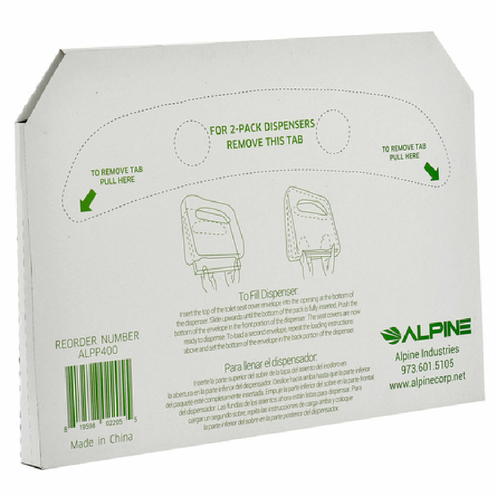 The Alpine Industries ALPP400 Toilet Seat Cover is a commercial-grade hygienic accessory designed for use in public restrooms and high-traffic facilities. Measuring 15-1/4 inches wide, 1 inch deep, and 10-5/8 inches high, this half-fold seat cover is constructed from eco-friendly, biodegradable virgin pulp in a durable white finish. Its universal fit ensures compatibility across a broad range of toilet models, while its flushable and self-disposing features facilitate sanitary waste removal. Suitable for institutional and hospitality environments, the ALPP400 enhances restroom hygiene and operational efficiency by providing a convenient, environmentally responsible solution for maintaining cleanliness and reducing cross-contamination risks.