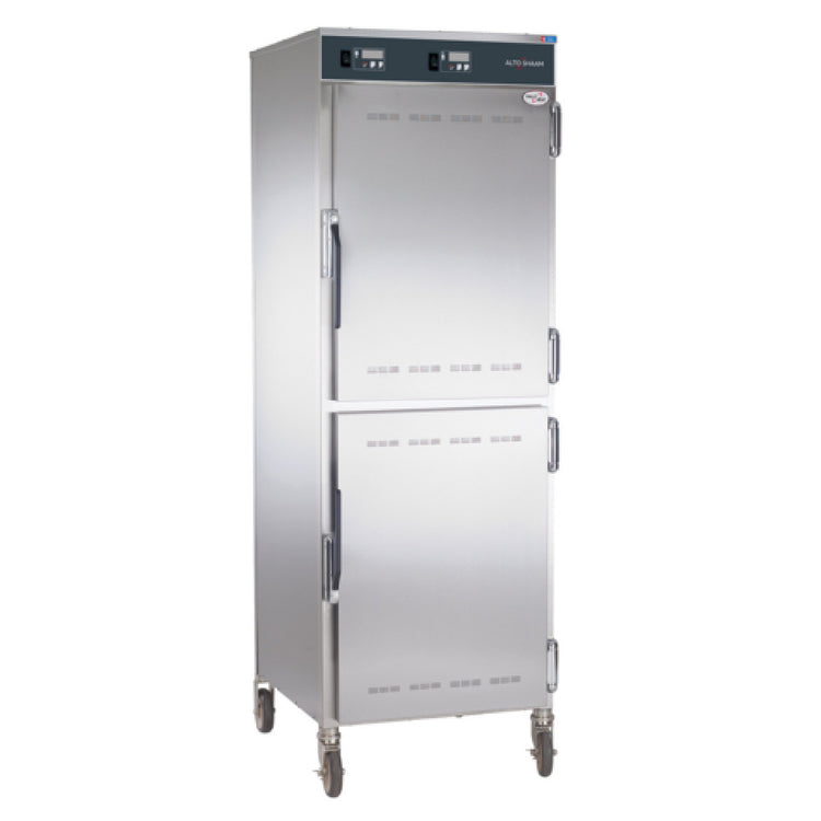 The Alto Shaam 1200-UP_208-240/60/1 Halo Heat® Low Temperature Holding Cabinet Double Compartment is a commercial-grade mobile heated cabinet designed for precise temperature maintenance in high-volume foodservice environments. Constructed with a heavy stainless steel exterior, this model features the Halo Heat® low temperature heat technology, ensuring uniform holding with minimal product dehydration. Its double compartment design includes a solid Dutch-style split door with insulation, adjustable thermostats, and simple on/off operation, accommodating up to (16) full-size pans of 20" x 12" x 2-1/2". This unit is ideal for catering, banquet facilities, and restaurant applications requiring reliable, energy-efficient temperature holding, supported by ENERGY STAR® compliance and advanced safety standards. Technical specifications highlight its dimensions, weight, and electrical requirements, making it suitable for integration into professional kitchen workflows demanding precise temperature control and durable construction.