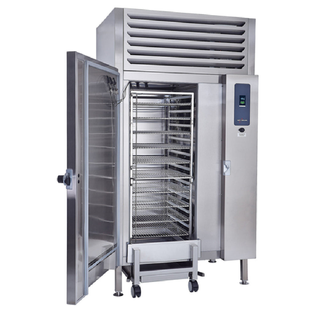The Alto Shaam QC3-100 Quickchiller™ Blast Chiller Roll-in Self-contained With Dual Refrigeration Systems represents a commercial-grade food preservation technology designed for high-volume foodservice environments. This precision-engineered blast chiller features a self-contained refrigeration system with dual compressors for enhanced reliability and consistent temperature control. Capable of accommodating (40) 12" x 20" pans, it offers rapid cooling, freezing, and holding modes suitable for restaurants, catering operations, and institutional kitchens. The unit’s robust stainless steel interior and exterior ensure durability and ease of sanitation, while the intuitive touch control with 20 preset menus streamlines workflow for food safety and efficiency. Its advanced features include three product temperature probes and automatic defrost cycles, making it an essential component for precise inventory management and batch processing in demanding foodservice settings.