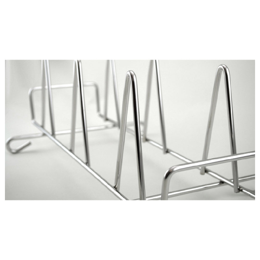 This chicken rack features a stainless steel construction with a (6) chicken capacity, optimized for consistent heat transfer and durability. It fits inside a standard full-size hotel pan, facilitating easy placement and removal. Compatible with ovens capable of holding 10 racks, it supports efficient workflow in commercial kitchens with high poultry throughput. The rack ensures uniform cooking, simplifies cleaning with its corrosion-resistant material, and is suitable for frequent use in busy foodservice operations designed for mid-volume output.