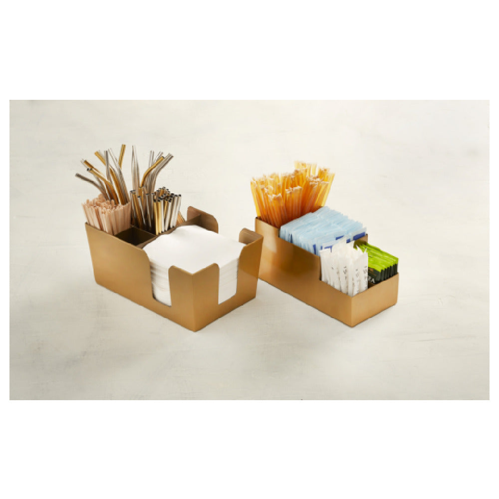 The American Metalcraft BARG5 Coffee Caddy offers a compact, metal construction designed for durability in commercial kitchens. Its gold finish adds a decorative touch while maintaining resistance to corrosion. The 4" x 4" dimensions optimize countertop space, facilitating quick replenishment and cleaning. This condiment caddy supports ergonomic handling with lightweight portability, suitable for high-volume guest service stations, and simplifies workflow with easy-to-clean surfaces. Its three-section design allows efficient segregation of coffee pods, tea bags, or sweetener packets, enhancing workflow efficiency in hospitality settings.