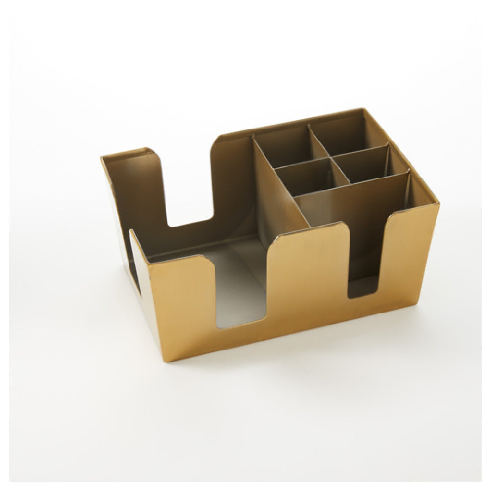 The BARG7 Bar Caddy offers a stainless steel construction with a polished gold finish, designed for durability under frequent handling. Its five-compartment layout facilitates organized storage of garnishes and utensils, with dimensions tailored for quick access in high-demand environments. The unit’s corrosion-resistant grade of stainless steel ensures long-term performance, while its straightforward design simplifies cleaning and maintenance. Compatible with countertop or bar rail mounting, it improves workflow efficiency by keeping necessities within arm’s reach. Its robust build supports consistent use in moderate to high-volume beverage service settings, making it an essential organizational tool for professional bars.