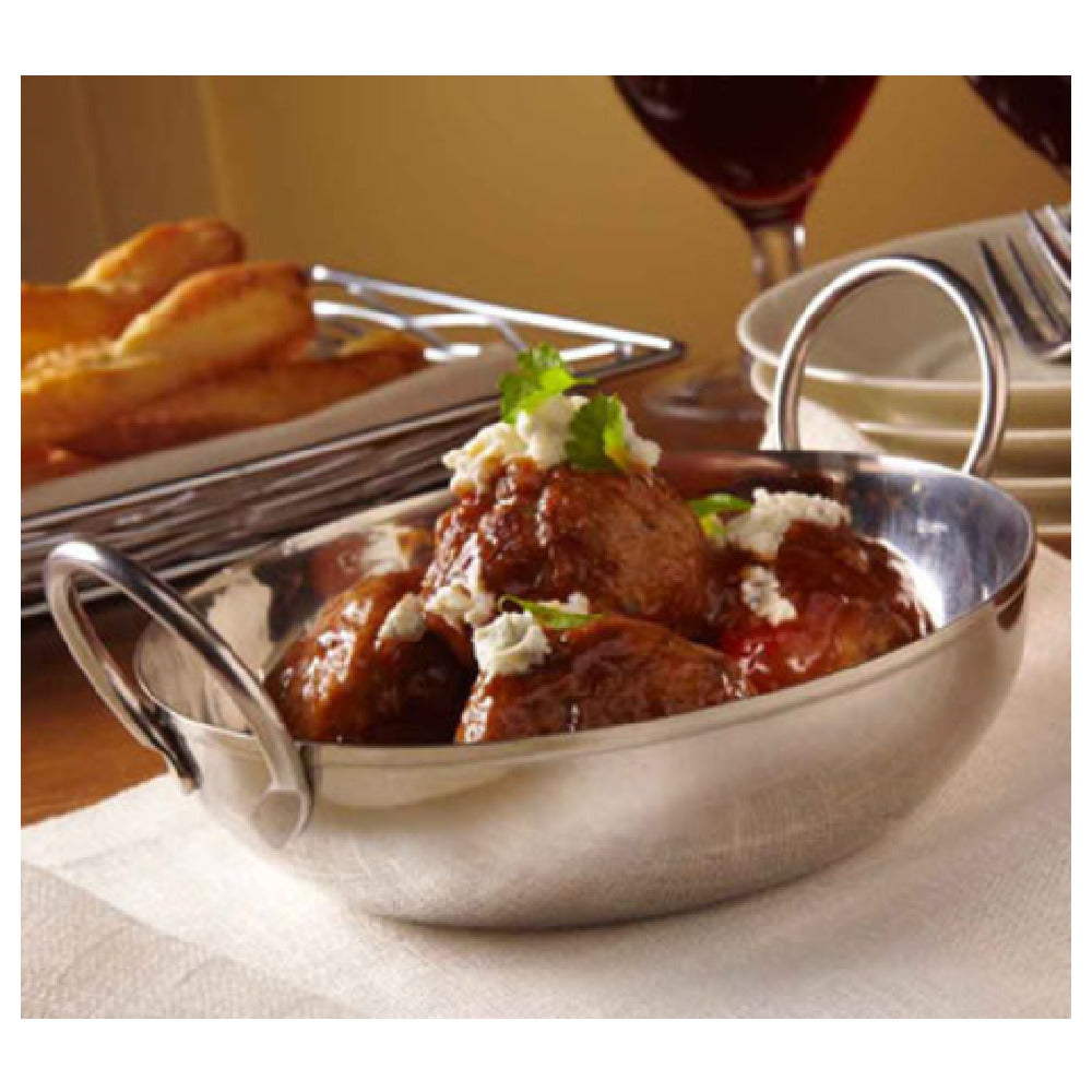 The American Metalcraft BD55 Balti Dish is constructed from stainless steel with a polished mirror finish, measuring 5-3/4" in diameter and 2-3/4" in height. It features a 7-1/4" overall width including handles, which are integrated for ergonomic transportation. Weighing approximately 0.35 lbs, this round dish supports moderate-duty applications in foodservice settings. Its material withstands daily cleaning and consistent use without corrosion. Designed without electrical or refrigeration components, its primary advantage lies in robust construction for serving hot or cold foods. It is compatible with standard commercial dishwashing routines and maintains safe operating ranges within typical kitchen environments.