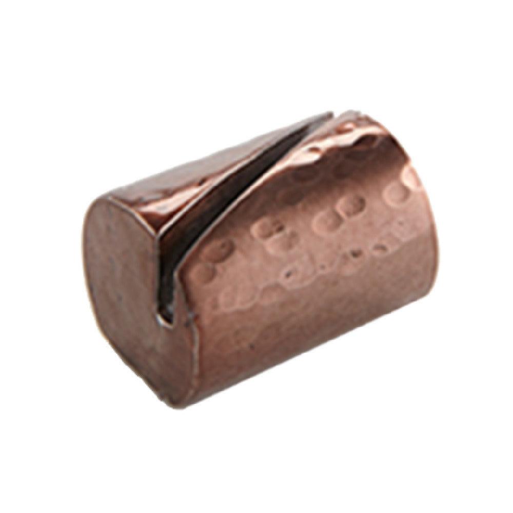 The American Metalcraft BHCHL2 Menu Card Holder is a precision-engineered tabletop display accessory designed for professional foodservice environments. Crafted from durable copper with a hammered finish, this angled cut cylinder measures 1-1/4 inches in length, 7/8 inches in width, and 7/8 inches in height, providing a sleek and functional solution for displaying menu cards or number identifiers. Its engineered dimensions and handcrafted finish make it ideal for use in high-volume restaurant, catering, and hospitality settings requiring reliable signage presentation with aesthetic appeal.