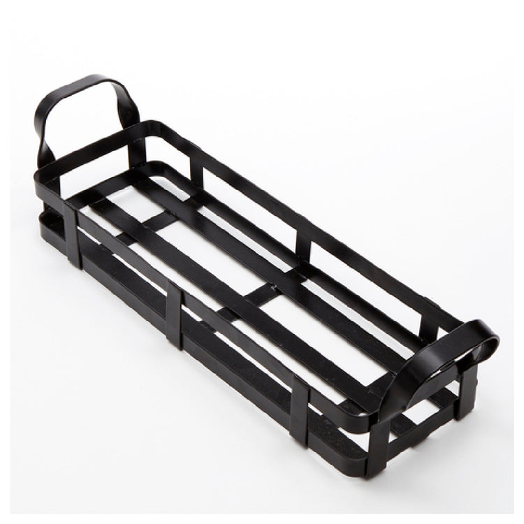 The American Metalcraft BWC12 Condiment Rack is a commercial-grade accessory designed for organized condiment presentation in foodservice environments. Measuring 12-3/4 inches in length, 4-3/8 inches in width, and 3-1/2 inches in height, this rectangular condiment caddy features durable metal construction with a black finish. Equipped with handles for ease of transport and cleaning, it is optimized for countertop or station use, offering a sturdy platform for holding condiments, utensils, or small items in busy kitchen, cafeteria, or buffet settings. Its compact yet functional design addresses space efficiency and workflow integration in various foodservice facilities.