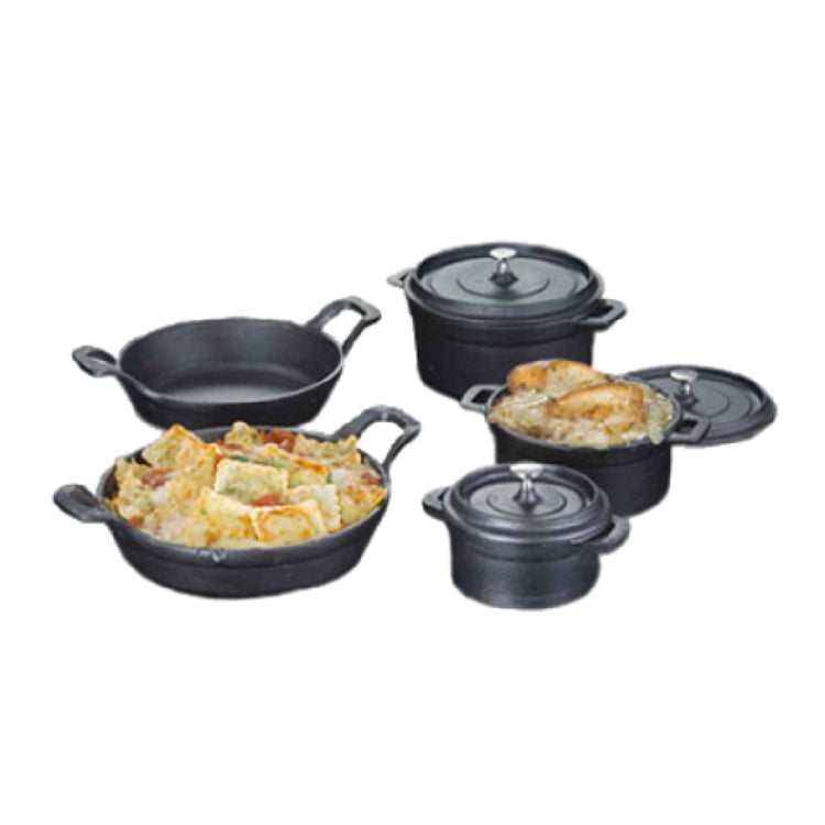 A commercial cast iron baking dish is a robust, high-capacity vessel designed for professional foodservice environments. It provides superior heat retention and even distribution, supporting consistent baking, roasting, or serving. Models like the American Metalcraft CIPR6250 are typically used in restaurants, catering, and bakeries where durability, heat performance, and ease of handling are critical. With dimensions of 6-1/4 inches in diameter and a capacity of 19 ounces, these dishes are ideal for preparing a variety of dishes, including casseroles and baked desserts, in mid-volume culinary operations.