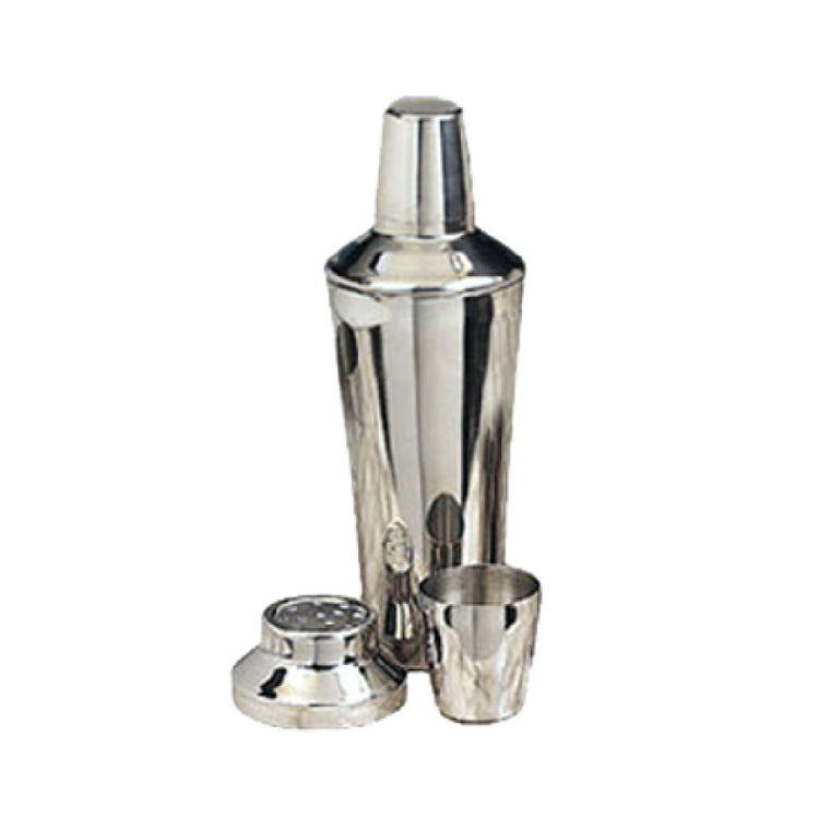 This bar cocktail shaker offers a robust 28 oz. capacity, crafted from high-quality stainless steel for durability under vigorous use. Its three-piece design includes a strain top and jigger cap for streamlined cocktail mixing and measurement. The mirror finish provides an attractive appearance while facilitating easy cleaning. Its universal fit for standard bar glasses ensures quick, efficient service, and the stainless steel construction resists corrosion, making it suitable for frequent commercial use.