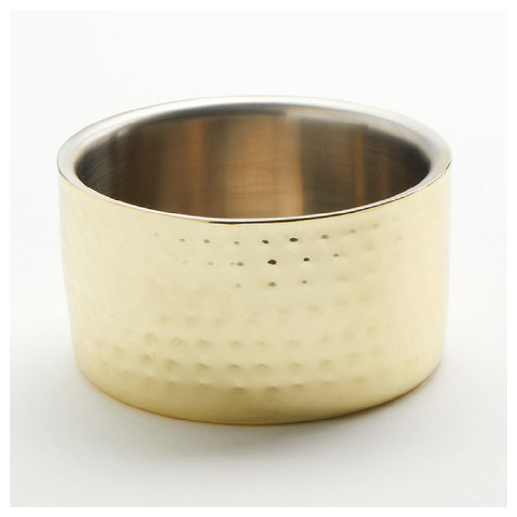 The American Metalcraft GHW4 features a 17 oz. capacity with a 4-3/4" diameter and 2-1/2" height, constructed from high-grade stainless steel for durability and corrosion resistance. Its hammered gold finish provides an upscale appearance suitable for fine-dining environments. The bowl weighs approximately 0.67 lbs, designed for easy handling and stacking. No electrical requirements are needed, making it a straightforward addition to existing serving setups. This model supports temperature retention for both hot and cold foods, with a practical 4-inch diameter size ideal for standard portions. The double-wall insulation ensures superior heat retention, while its rounded, polished design simplifies cleaning and reduces sanitation concerns. The product's construction supports routine dishwasher cleaning, helping maintain hygiene standards in busy kitchens. It is compatible with various display and serving arrangements, fitting seamlessly into tiered presentations and buffet lines.