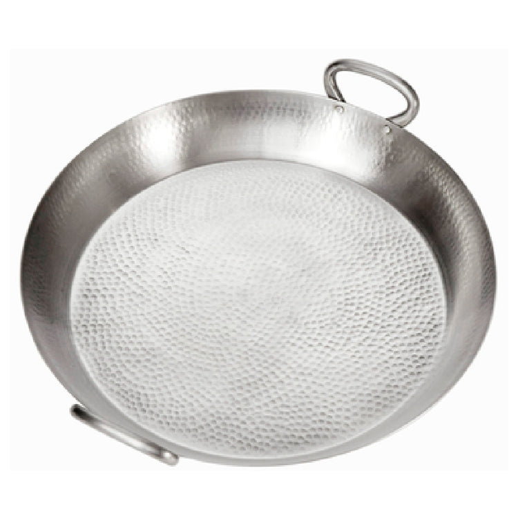 The GP21 paella pan is engineered for professional foodservice environments requiring large, efficient cooking surfaces. Its stainless steel construction ensures longevity under heavy use, while the hammered exterior facilitates even heat spread. Designed for ease of cleaning and handling, it integrates seamlessly into open flame or griddle setups, supporting high-volume paella or specialized hot dish service. The pan's size and shape optimize workflow in busy kitchens, enabling rapid preparation of authentic rice dishes and other large-batch items, thus elevating operational productivity in commercial kitchens.